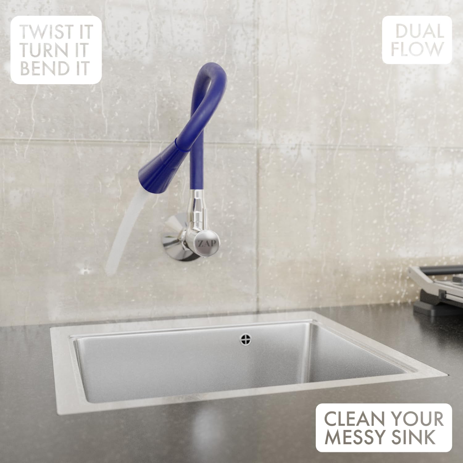 ZAP Elixir Brass Sink Cock – Modern Blue & Chrome Finish Kitchen Faucet | Wall Mounted Tap with 360° Flexible Dual Flow Spout | Rust-Free, Water-Saving Aerator | Ideal for Modular Kitchens