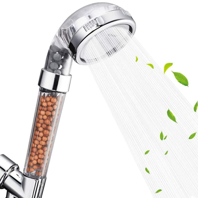 The showerhead is equipped with replaceable mineral filter beads that help purify water by removing chlorine, harmful impurities, and odor—gentle on skin and hair, ideal for sensitive users.