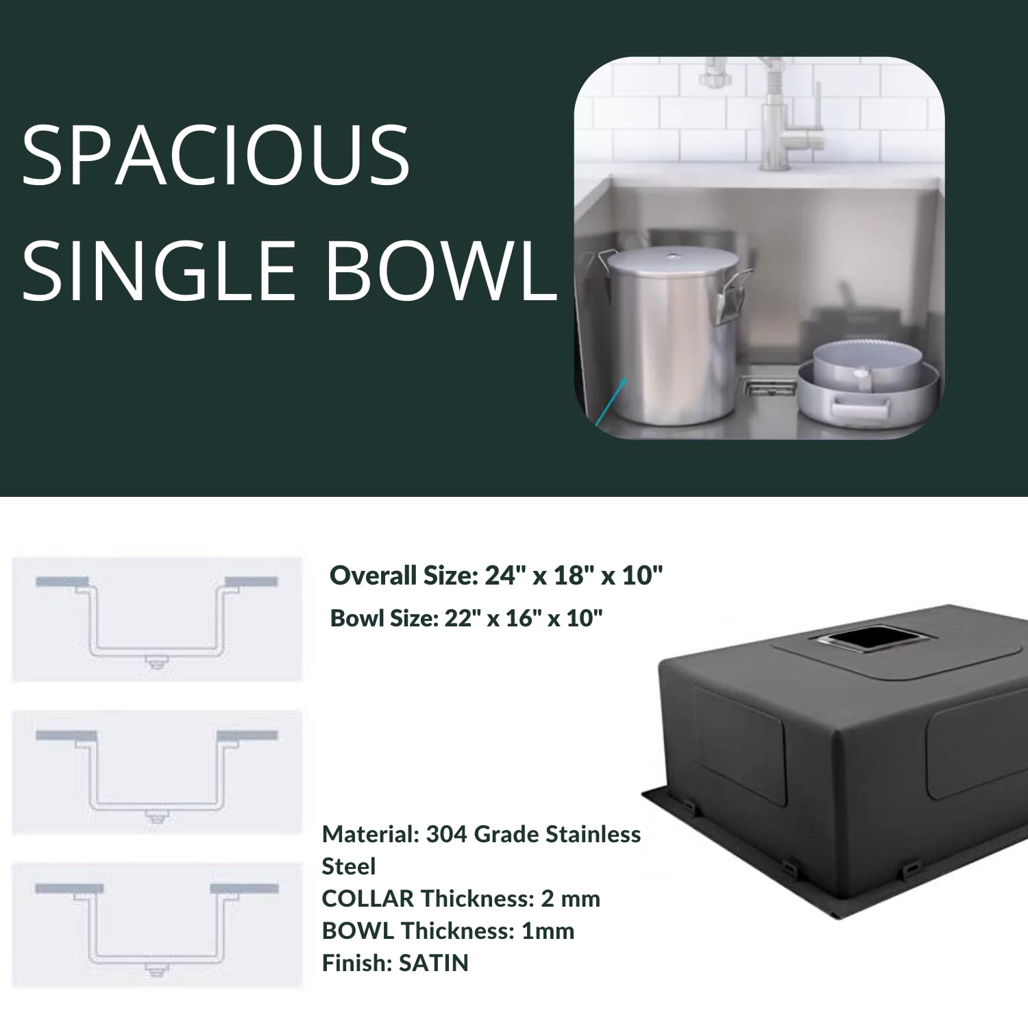 • Spacious 24 x 18 inch single bowl ideal for washing large cookware and daily use.