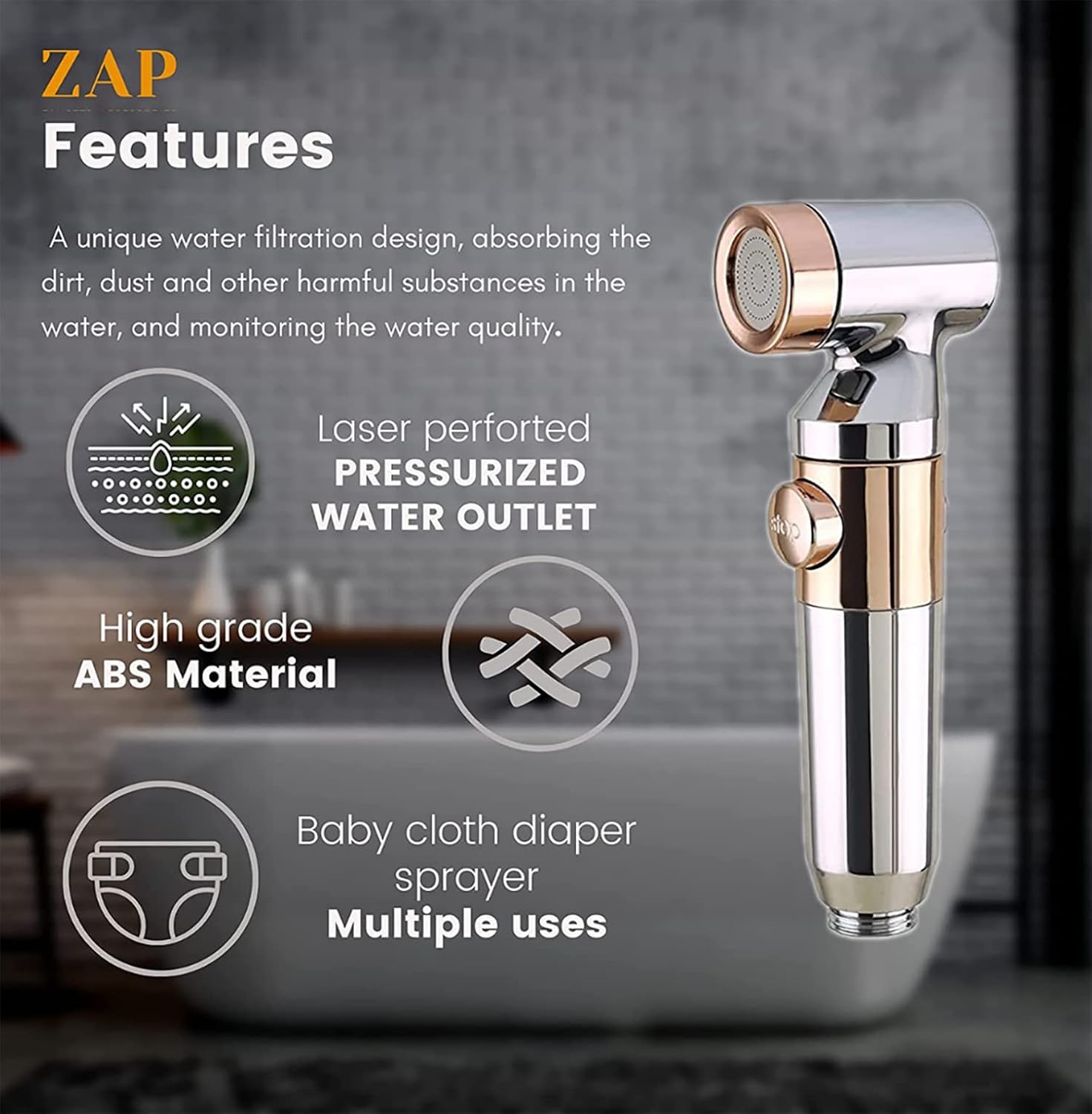 ZAP Ultra ZX1034 Health Faucet Handheld Toilet Jet Spray | ABS Bidet with Chrome Finish | 1.5m SS Hose, Angle Valve & Wall Hook | Multipurpose Spray Gun for Bathroom & Toilet