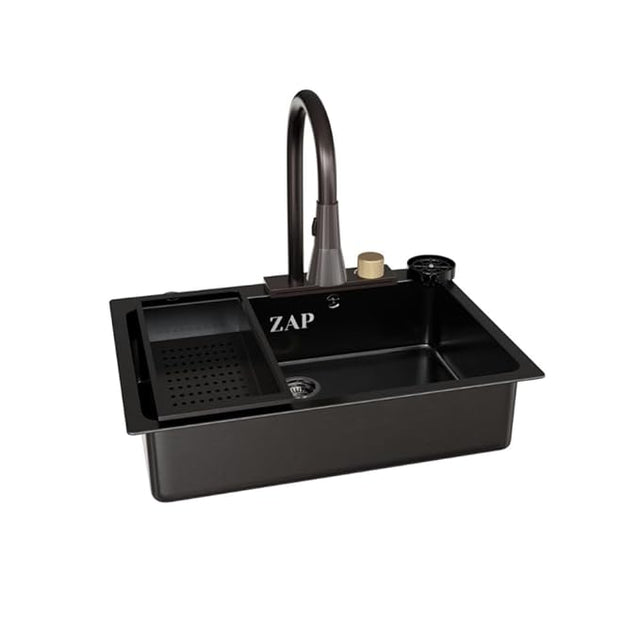1x ZAP Waterfall 304 Stainless Steel Kitchen Sink (24x18 Inch, Black Finish)