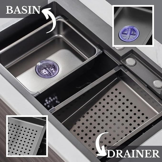 A. The sink features a sleek black finish, adding a modern and stylish touch to your kitchen while ensuring it is easy to clean and maintain.