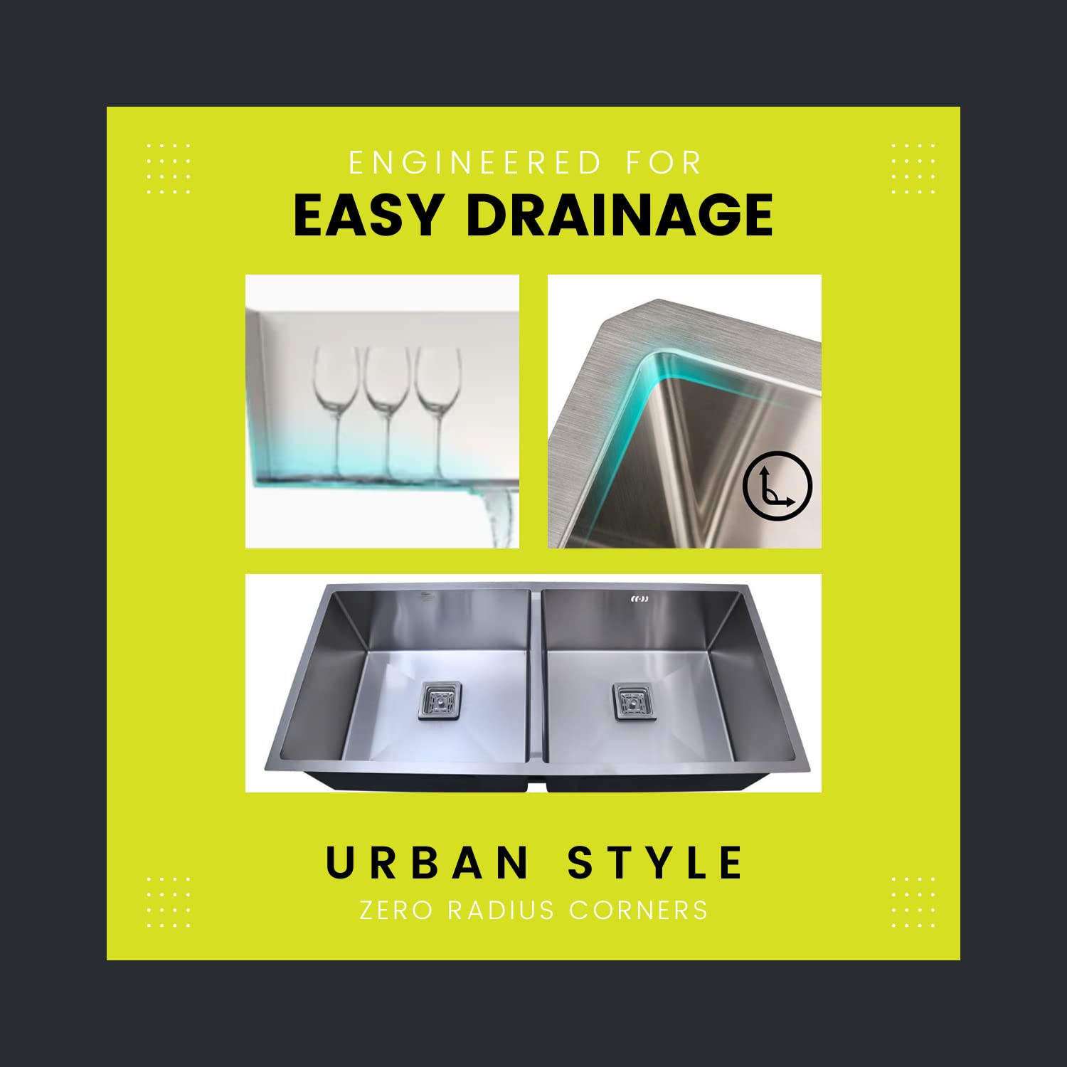 Spacious double bowl configuration (37x18 cm) allows for multitasking—wash in one bowl, rinse in the other. Designed with angled drainage, anti-clog basket, and noise reduction pads for a quiet, efficient kitchen experience.