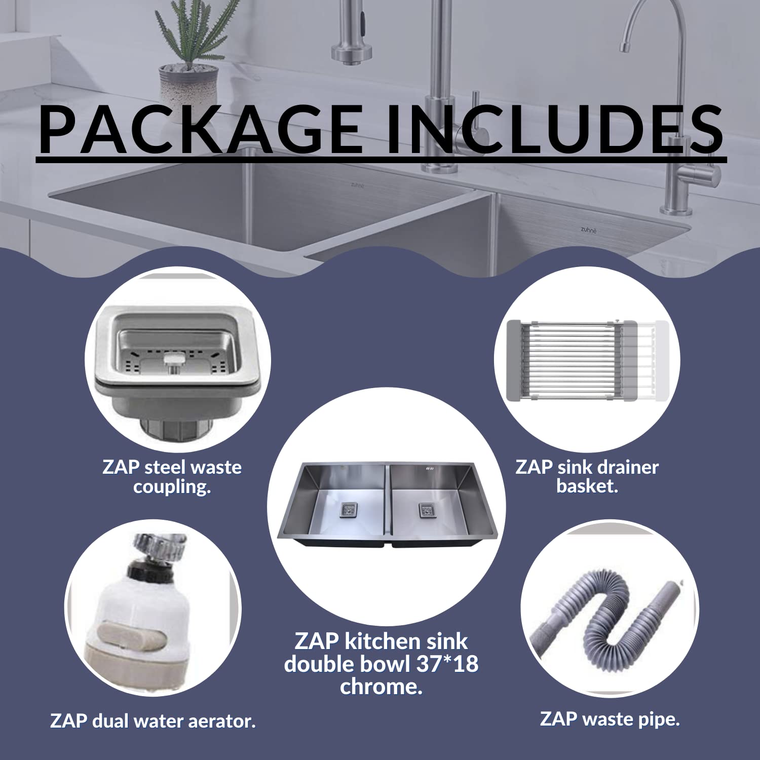 ZAP Double Bowl Stainless Steel Kitchen Sink – 37x18 cm Chrome Finish | Dual Water Aerator, Drainer Basket, Waste Pipe & Coupling | Noise Reduction Pads | Easy Drainage | Large Size for Modular Kitchens