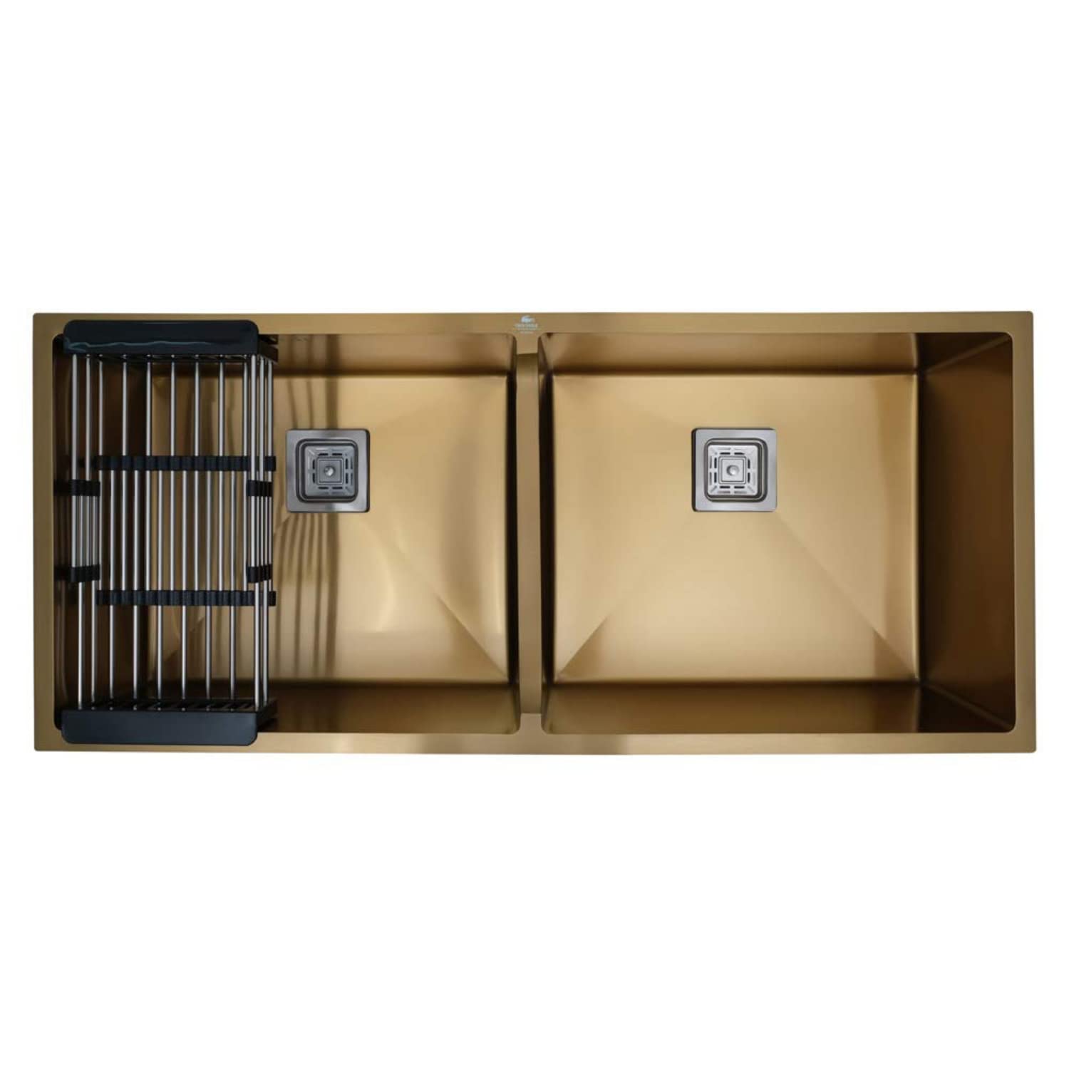 ZAP Double Bowl Stainless Steel Kitchen Sink – 45x20 cm Gold Finish | Dual Water Aerator, Fruit Basket, Drainer Basket, Waste Coupling & Pipe | Zero Radius Corners | Smooth Drainage for Modern Kitchens