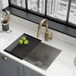 Sound-dampening pads help minimize noise from water flow and clattering dishes.
