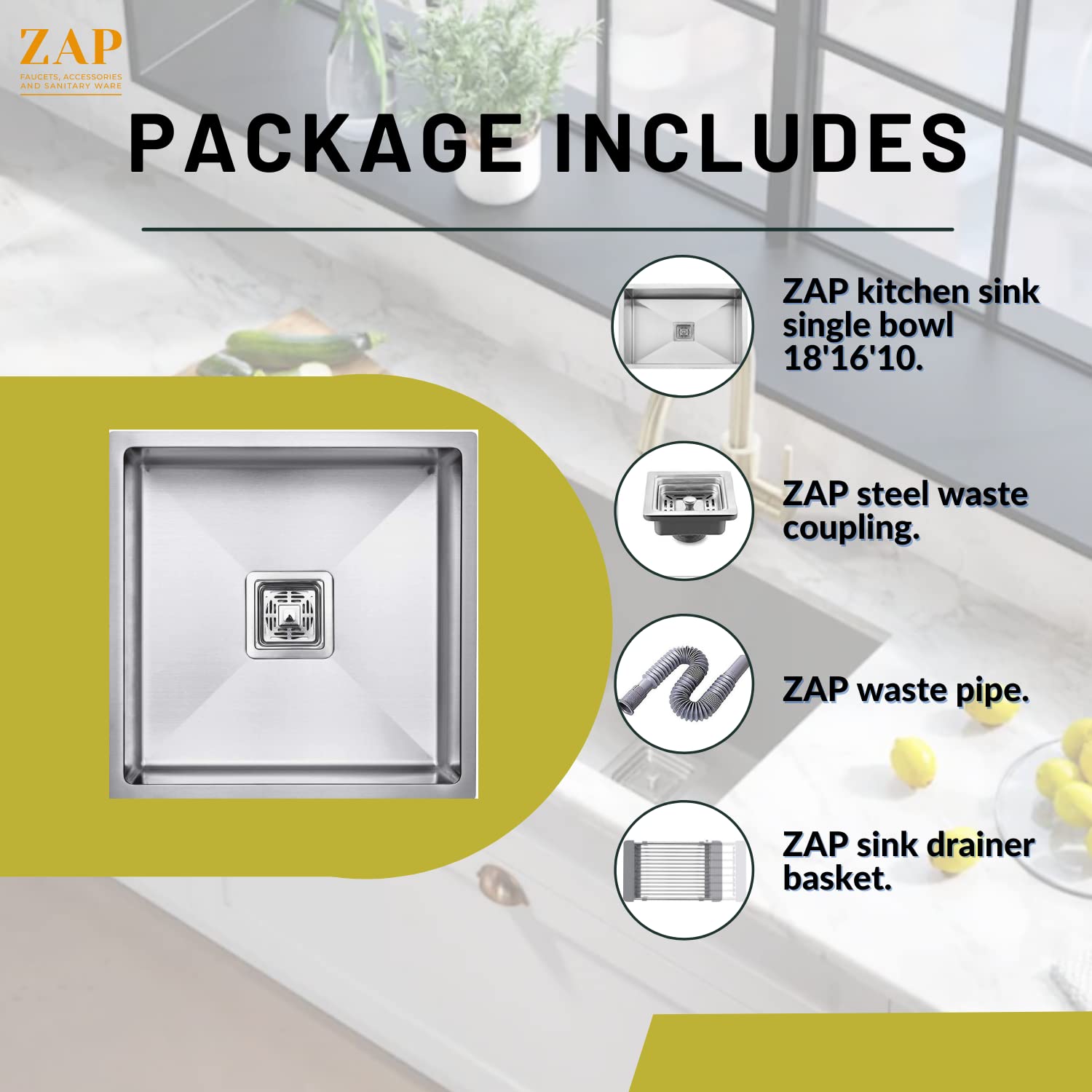 ZAP Kitchen Sink Spacious Single Bowl 18x16x10 Inch | Matte Finish Thick Stainless Steel | Includes Steel Waste Coupling, Waste Pipe & Sink Drainer Basket | Durable & Stain Resistant