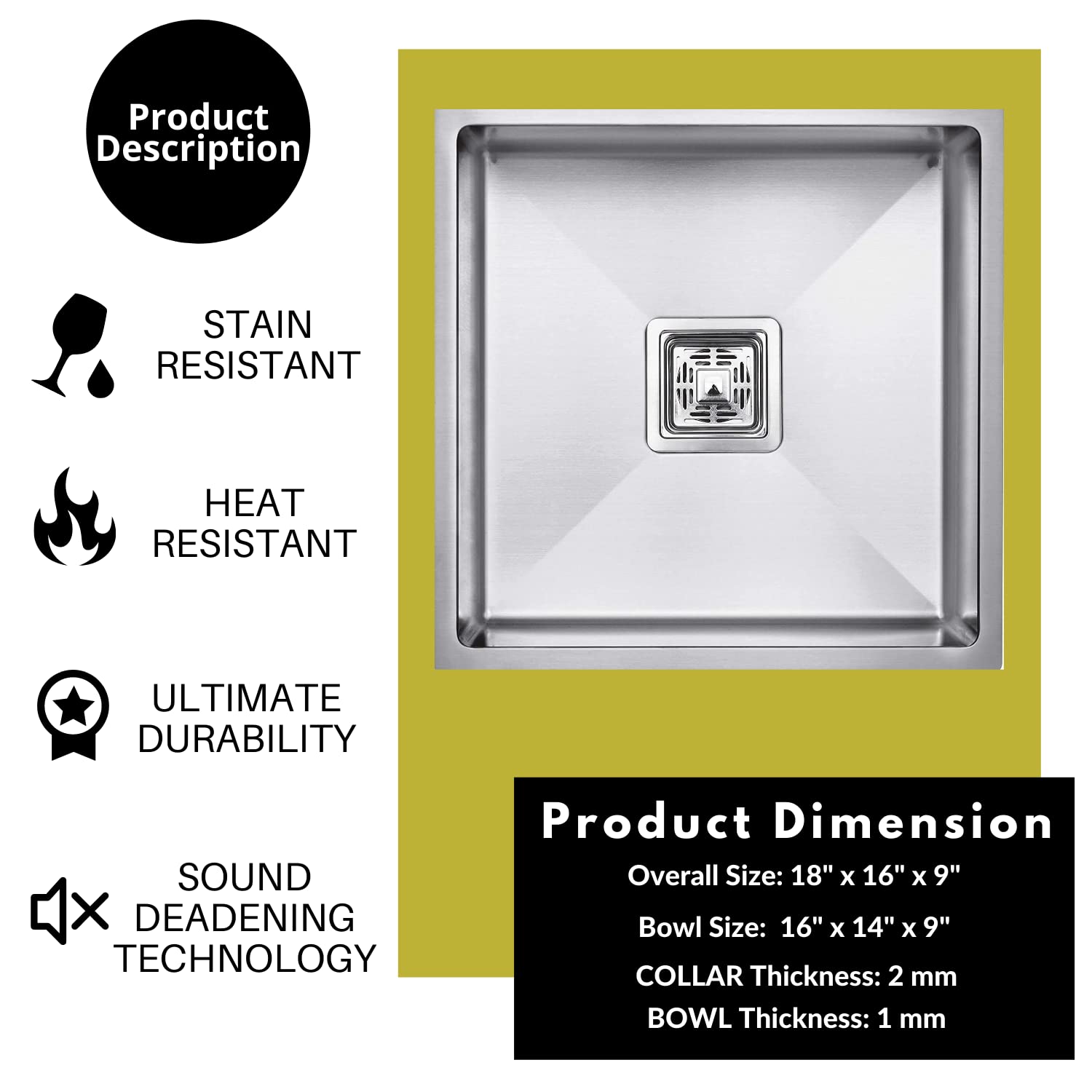 1x Single Bowl Kitchen Sink (18 x 16 x 10 Inch, Matte Finish)