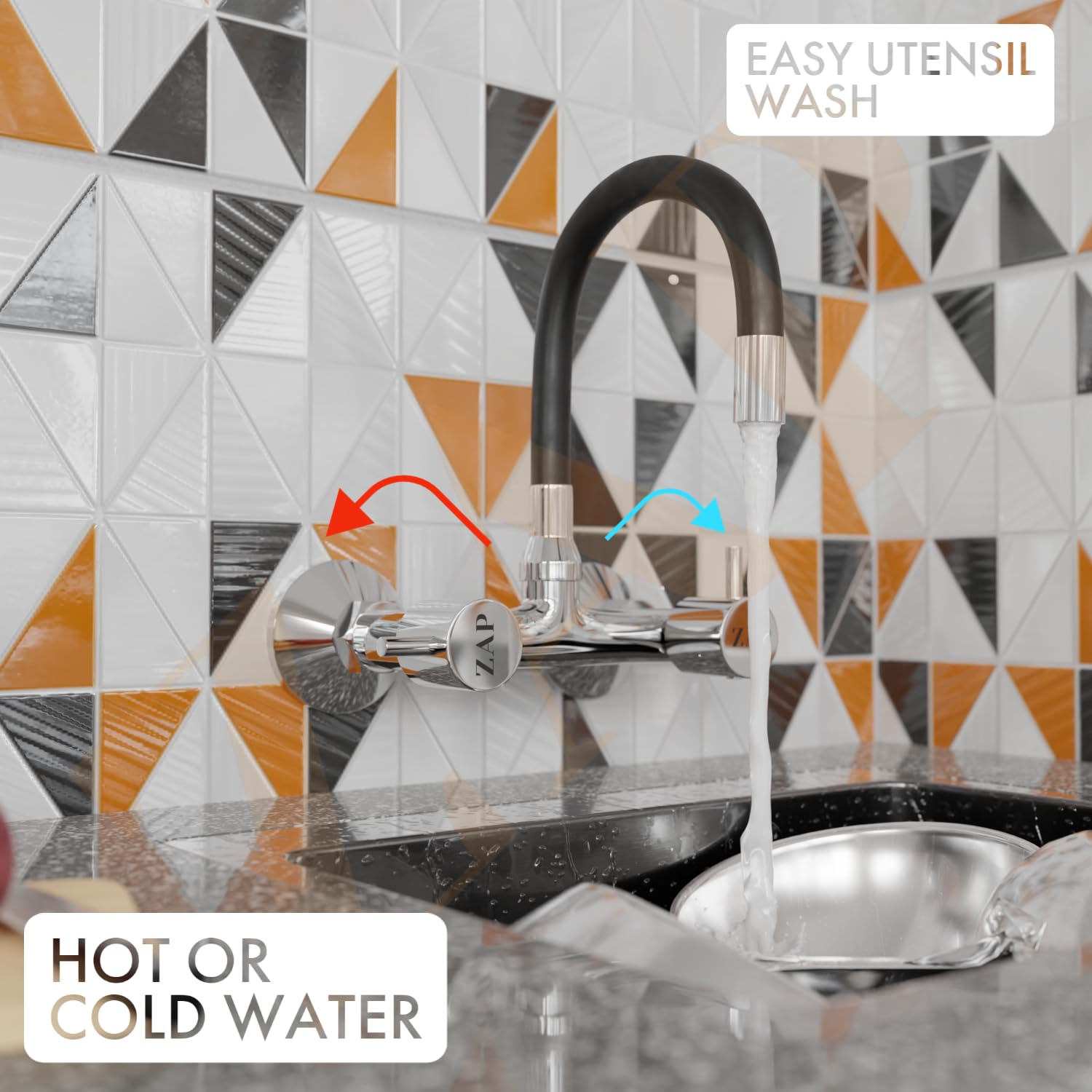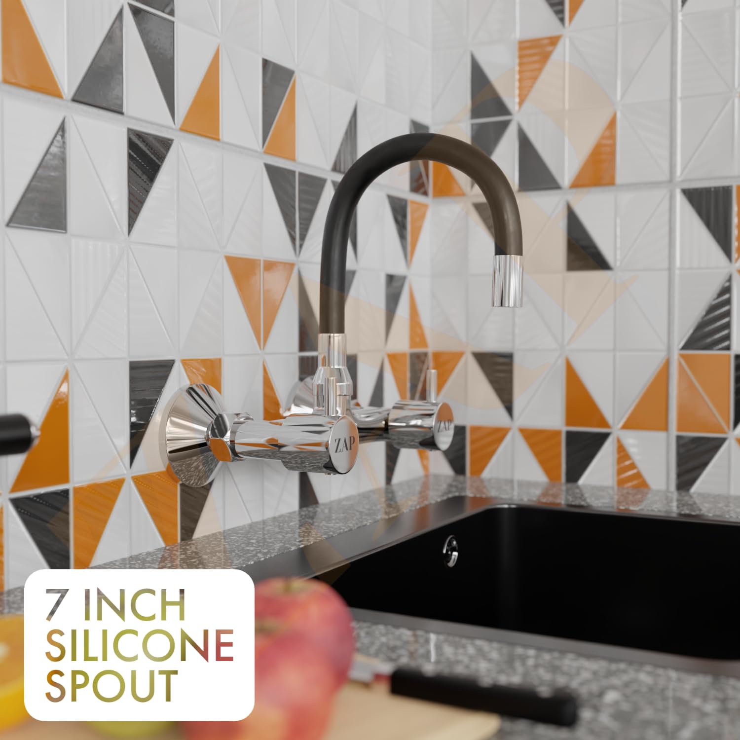 Add a blend of innovation and elegance to your kitchen with the ZAP Elixir Brass Sink Mixer. Designed for wall-mounted installation, this stylish mixer tap features a flexible black silicone spout with 360° swivel motion and precision control for hot and cold water—perfect for modern Indian kitchens.