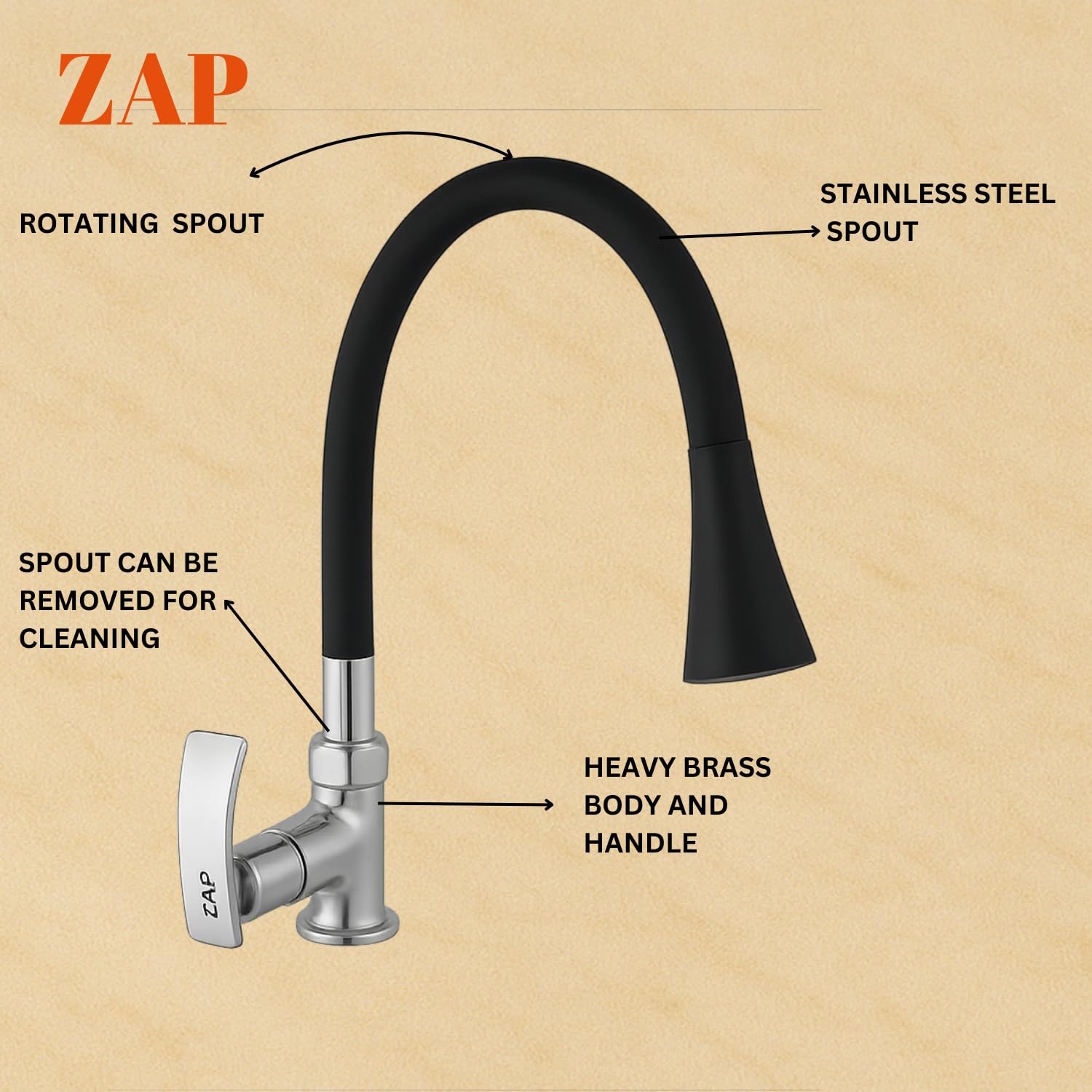 ZAP Soft High Grade Brass Kitchen Tap | Swan Neck Design | 360° Swivel Spout | Dual Flow | Flexible Silicone Spout | Rust-Proof | Hot & Cold Mixer | Chrome Finish