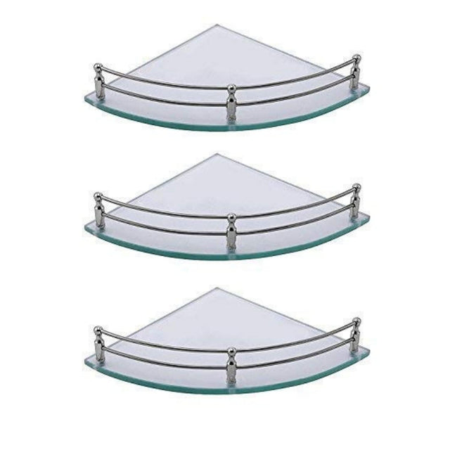 - This set of corner shelves from ZAP is made from glass that renders a glossy finish. The glass shelves enhance the look of the room, kitchen or washroom.