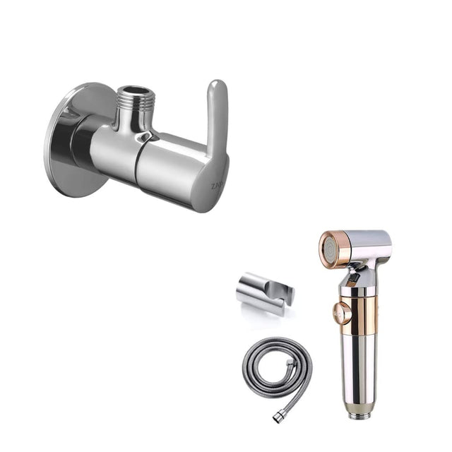 Ultra ZX1034 Health Faucet Handheld Toilet Jet Spray with 1.5 m Stainless Steel Tube, Wall Hook-Chrome & Angle Valve Finish Bidet with Hose and Holder/Clutch Set (Chrome Gold)